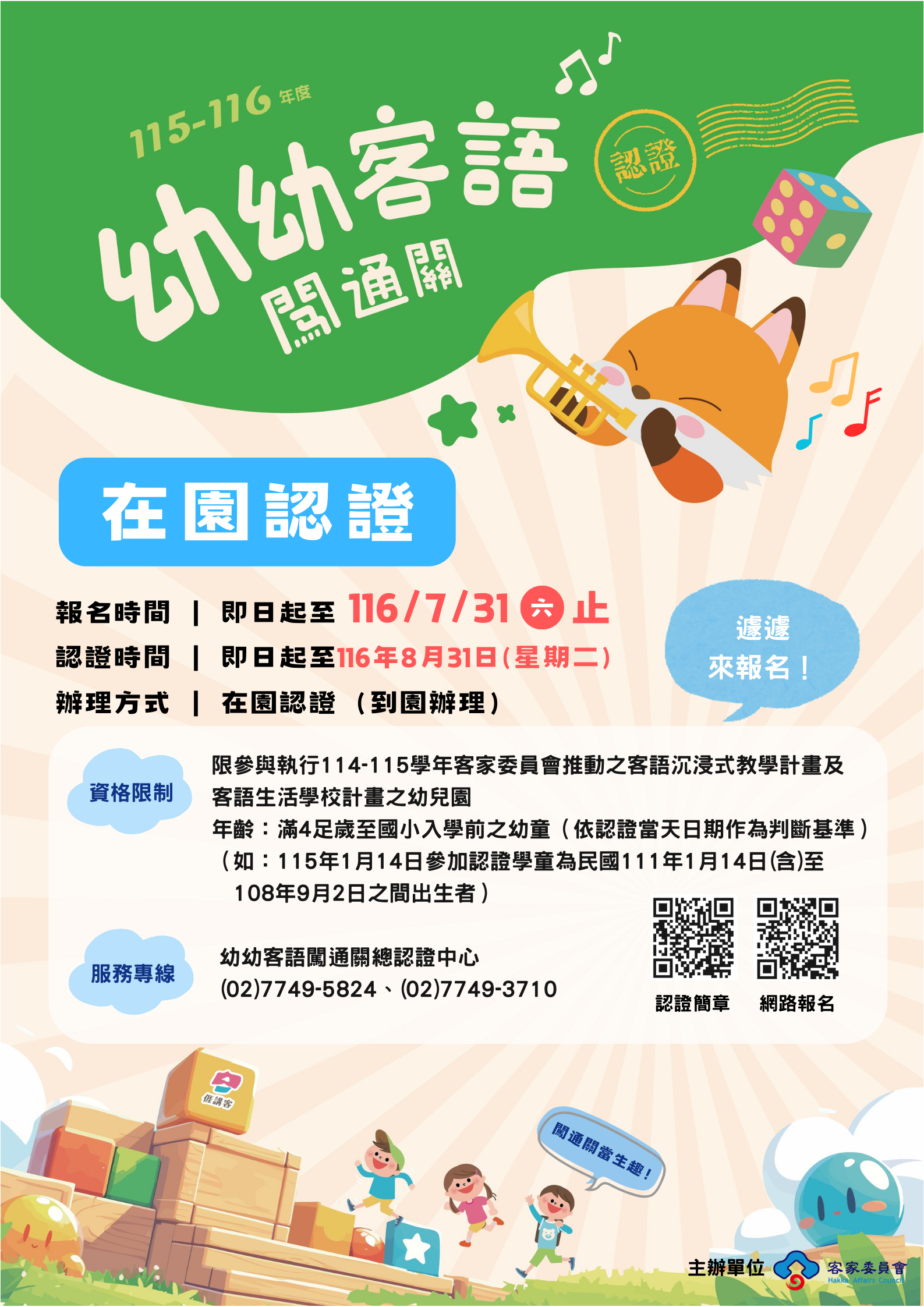 共同性公告-【轉知】有關客家委員會委託國立臺灣師範大學辦理「115-116年度幼幼客語闖通關認證」在園認證活動,敬請各公私立幼兒園踴躍報名參加, 請查照。